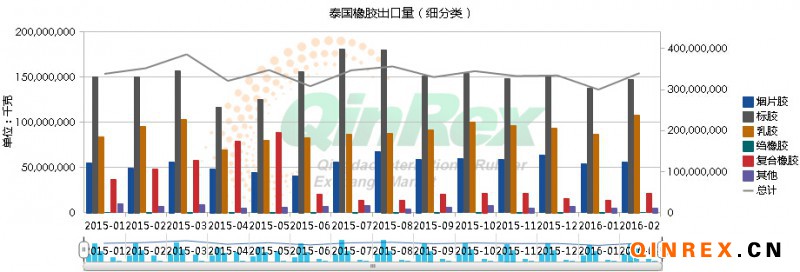 QinRex據泰國海關3月30日消息,2016年2月橡膠(含復合橡膠)出口量同比降3%至34萬噸,環比增13%。