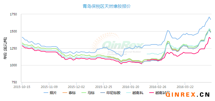 本周青島保稅區天然橡膠美金現貨價格連續大幅上漲,主要是因產區處于季節性供應淡季,市場原料供應緊張,原料價格走高影響,本周市場標膠報價活躍,越南膠貨源稀少,鮮有報價。據了解區內庫存繼續下滑,下游工廠開工良好,按需采購,廠內庫存低位,后期需求預計較好。