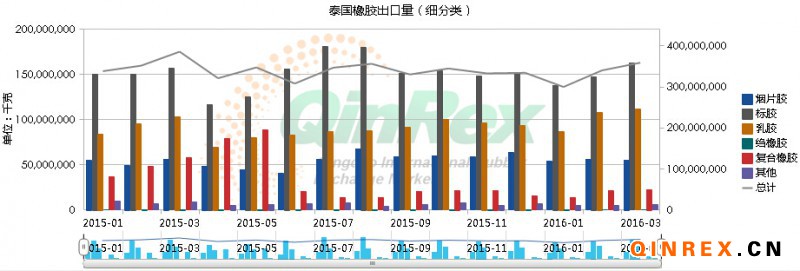 QinRex據泰國海關4月27日消息,2016年3月橡膠(含復合橡膠)出口量同比降7%至36萬噸,環比增5.5%。