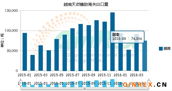 QinRex據越南5月13日消息,越南海關最新公布的數據顯示,越南2016年4月橡膠出口量為74,506噸,同比增46.7%,環比降18.3%。4月出口按排名依次為中國43,455噸、馬來西亞7,573噸、印度6,102噸、韓國2,336噸、德國1,342噸。