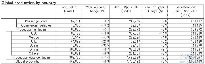 4月份日產全球汽車產量為449,866輛,同比增長了8.9%,創下同期銷量紀錄;其中日本本土產量同比下跌5.1%至60,086輛,海外工廠產量則同比攀升11.4%至389,780輛,連續第十二個月實現增長。1-4月份日產累計全球產量為1,776,192輛,同比增長5.5%。
