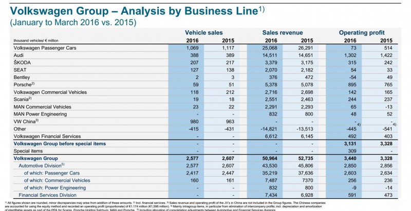 2016年第一季度,大眾汽車集團營業收入、產銷量、稅后利潤等指標均同比下滑,只有營業利潤和交付銷量小幅攀升。核心品牌大眾乘用車利潤同比暴跌85.8%之多,而另行核算的中國業務利潤也下滑了27%。