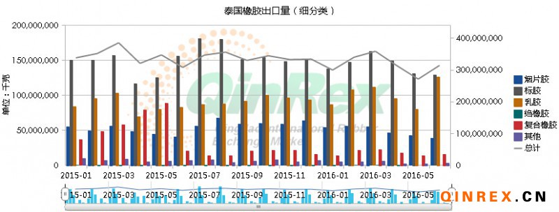 QinRex據泰國海關7月27日消息,2016年6月橡膠(含復合橡膠)出口量同比增1.8%至31萬噸,環比增16%。
