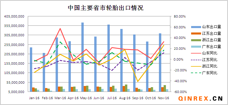 就輪胎各主要出口省市來看,按重量計算,除上海市同比下滑9.1%以外,全國各地一片飄紅,同環(huán)比均實現(xiàn)增長。本月山東省輪胎出口量同比大幅上漲32.8%,為自四月份以來的最大增幅,環(huán)比也增加16.1%,直接導致本月全國輪胎出口總量大增。其他的幾個輪胎出口大省,浙江、江蘇、廣東、安徽、河南同比分別增長26.5%、12.4%、16.9%、5.5%和19.6%,環(huán)比分別增長39.2%、17.7%、24.8%、5.0%和26.4%。此外,本月其他省市出口量也呈現(xiàn)不同程度的增長。