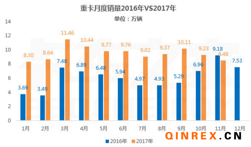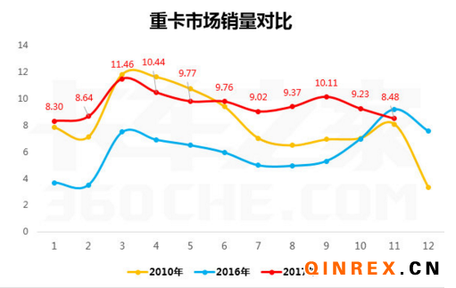 自去年10月份以來,重卡銷量一路高歌,增勢強勁。2017年1-11月,重卡累計銷量104.82萬輛,這一銷量已經超過2010年101萬輛的成績,而且還有一個月的銷量尚未計入。毫無疑問,2017年的重卡銷量成績,將會開啟中國重卡史上一個新的紀元。