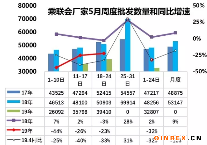 5月第一周的乘用車零售達到日均3.35萬臺的偏低水平,同比18年5月第一周下滑24%,下滑幅度不是很大。近幾個月的開局一周下滑都是最大的,今年5月的經銷商零售很努力。