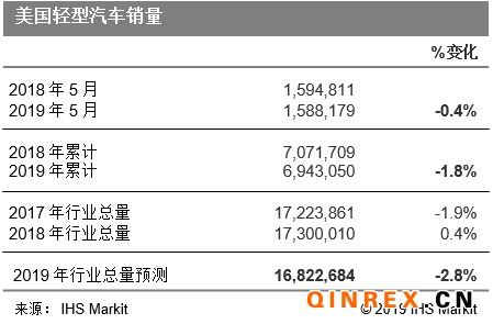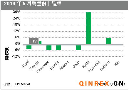 隨著輕型汽車整體需求持續下降,汽車制造商月度銷量表現也反映出競爭日益加劇。通用汽車和福特的銷量預計將維持其2019年的下滑勢頭,不過菲亞特克萊斯勒和豐田的銷量分別增長1.9%和3.2%,扭轉了年初以來的下滑趨勢。與此同時,本田在經歷了銷量連續三個月同比增長后,5月份銷量下滑4.9%。斯巴魯、現代和大眾的銷量也有所改善。