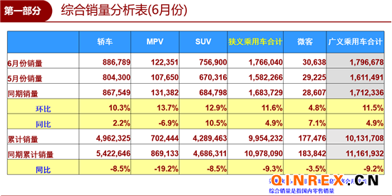 同時,“國五國六”切換對汽車生產也帶來了極大影響。5月,受國五車型減產、國六供給不足影響,狹義乘用車產量同比下降達23.2%。而至6月,狹義乘用車共生產1564980輛,環比上漲6.4%,同比下滑幅度略有縮小至17.6%,體現出“國五國六”切換過程雖對市場造成了很大沖擊,但目前來看進程已相對順利,國六車型產量開始逐步提升。綜合來看,1-6月,狹義乘用車共生產9761992輛,下滑幅度仍達到16.3%,車市低迷盡顯。