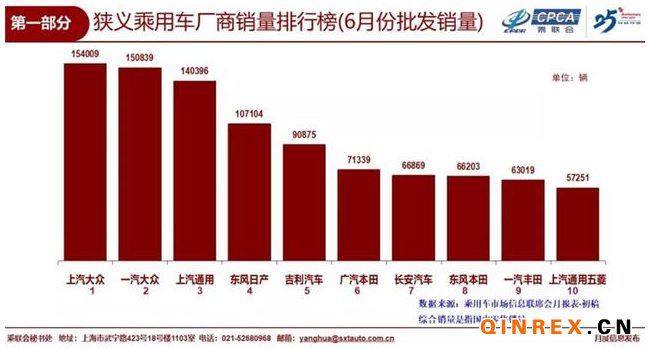 分廠商來看,2019年6月,上汽大眾、一汽大眾、上汽通用狹義乘用車銷量位居前三位,其銷量分別是15.4萬輛、15.1萬輛和14萬輛。東風日產以10.7萬輛位居第四位。吉利汽車、廣汽本田、長安汽車、東風本田、一汽豐田和上汽通用五菱分列第五至第十位。