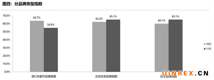 從分品牌類型指數看:2019年11月進口&豪華品牌指數54.9%,環比下降8.8個百分點,主流合資品牌指數、自主品牌指數較上月上升。