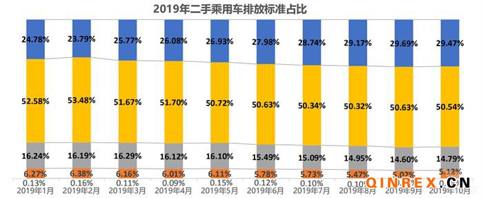 2019年1-10月,二手乘用車銷量以國四排放標準為主,平均占比50.98%。其次是國五排放標準,平均占比27.78%,國三、國二排放標準車輛平均占比分別為15.44%和5.70%。國一排放的車輛占比僅為0.10%
