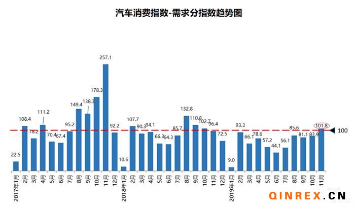 從構成汽車消費指數的分指數來看,2019年11月份需求分指數為101.8,較10月份上升,預計12月份消費者購車需求會有小幅上升;入店分指數為107.1,預計消費者在12月入店看車意愿提高;購買指數為109.7,預計12月份消費者實際購買意愿小幅上升。