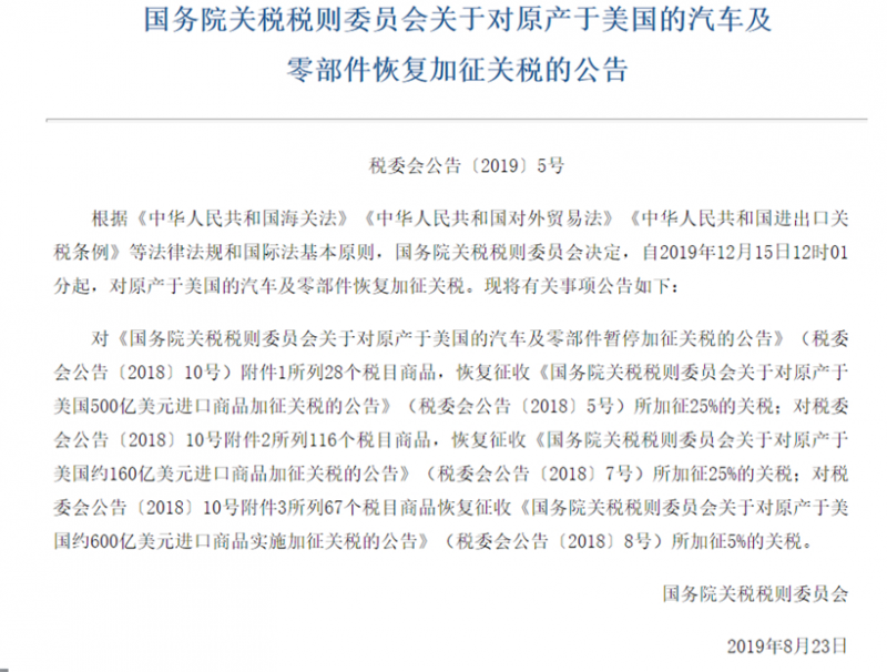 國務院關稅稅則委員會之所以在8月23日發布上述公告,意在回擊美國政府此前違背兩國元首阿根廷會晤共識和大阪會晤共識,而對中國進口商品發起的提高征收關稅門檻的行為。