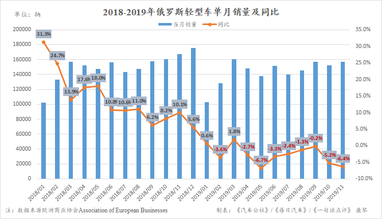 確實如此,截止11月,俄羅斯輕型車市場僅在1月和3月分別微增0.6%和1.8%,其余月份均為下跌,其中11月下跌6.4%,銷量為156,848輛。11月已是今年第九次下跌,這讓今年前11個月的總銷量僅為158.0萬輛,比去年同期減少2.8%。