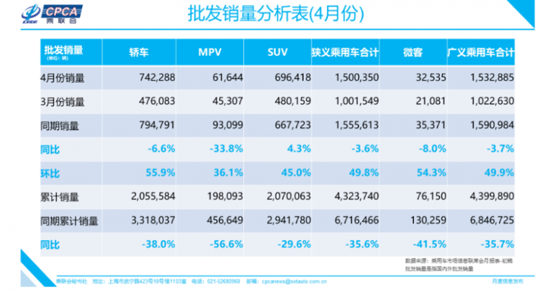 5月11日上午,乘聯(lián)會(huì)發(fā)布了4月份產(chǎn)銷數(shù)據(jù)。數(shù)據(jù)顯示,4月份乘用車市場(chǎng)整體復(fù)蘇明顯,狹義乘用車產(chǎn)量為152.15萬輛,同比下降5.6%;綜合銷量為142.91萬輛,同比下降5.6%;批發(fā)銷量為150萬輛,同比下降3.6%。與此同時(shí),4月狹義乘用車產(chǎn)銷量與3月份相比,環(huán)比均有30%以上的提升。