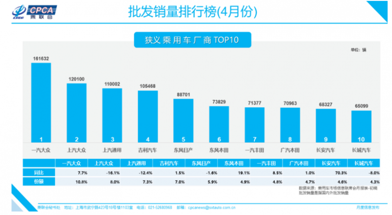 4月份,狹義乘用車批發(fā)銷量排名前十的車企基本回歸疫情發(fā)生前的正常水平。其中,一汽-大眾以16萬臺(tái)的單月銷量位居首位,上汽大眾和上汽通用分別位列第二和第三位。自主車企依然是吉利、長(zhǎng)安、長(zhǎng)城入圍,剩余席位則均被日系霸占。