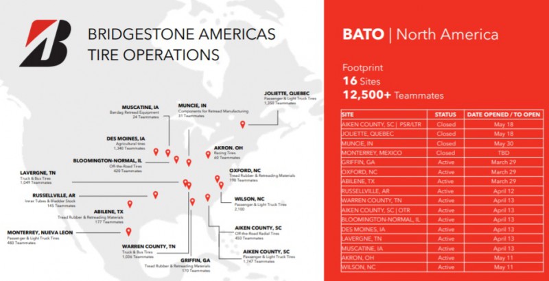 普利司通美國公司將在本月底前重新開放其北美乘用車輪胎工廠和拉丁美洲的所有工廠,這是其在COVID-19大流行病后重新啟動計劃的最后階段。
