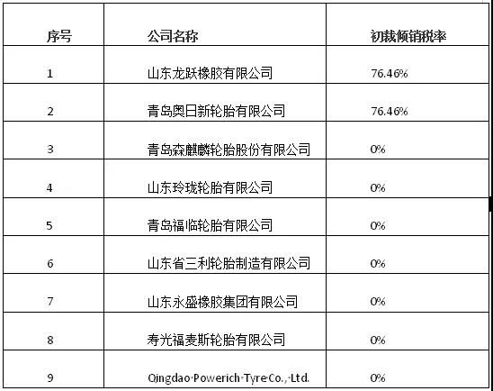 強(qiáng)制應(yīng)訴企業(yè)山東龍躍橡膠有限公司和青島奧日新輪胎有限公司因拒絕參與調(diào)查獲得了76.46%的稅率。青島森麒麟輪胎股份有限公司、山東玲瓏輪胎有限公司等7家企業(yè)獲得零稅率。