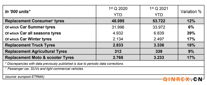 4月19日,歐洲輪胎和橡膠制造商協會(ETRMA)發布市場數據顯示,2021年一季度歐洲替換胎市場銷量在經歷了嚴重的2020年負增長之后,實現了積極的復蘇,合計銷量同比增加12.3%至6063萬條。