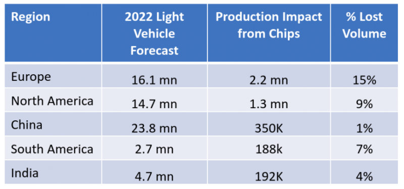 作為全球三大輕型車市場,北美、歐洲和中國市場均因零部件短缺和供應鏈問題而蒙受的大幅產量損失而成為了關注焦點。從缺芯問題導致的產量損失來看,歐洲和北美市場分列一二,兩者的產量損失或將分別超過200萬輛和100萬輛。南美市場的情況也與全球其它市場一樣——缺芯導致的停工時間無法預計,該地區的各車企只能艱難維持著產線的運營。