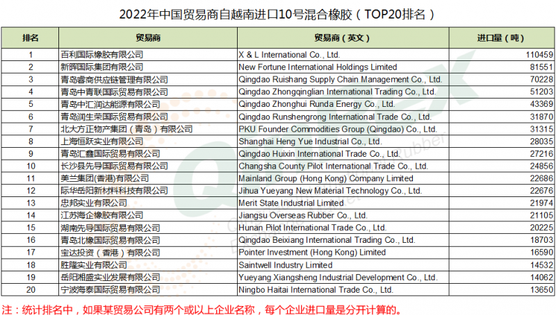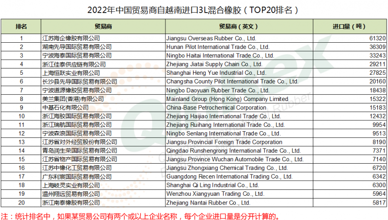 核心提示:2022年中國混合橡膠自越南進口量貿易商TOP30排名