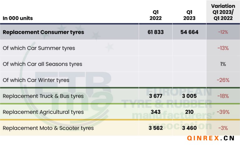 ETRMA秘書長表示,在經歷了2022年下半年的負面趨勢之后,與2022年第一季度相比,2023年第一季度所有產品類別的銷量均有所下降。我們必須在所有歐洲市場持續高通脹以及俄烏沖突持續產生負面影響的背景下看待這一下降,尤其是對能源價格的影響。另外,與2019年第一季度相比,卡車和客車輪胎的銷量保持在同一水平,但消費者更換輪胎的銷量下降了四個半百分點。