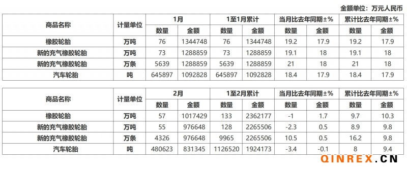 核心提示:QinRex據(jù)中國海關(guān)總署3月18日公布的數(shù)據(jù)顯示,2024年1-2月中國橡膠輪胎出口量達(dá)133萬噸,同比增長9.7%;出口金額為236.22億元...