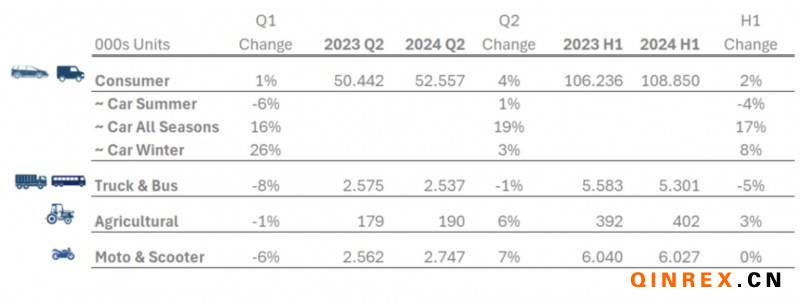 ETRMA秘書長(zhǎng)表示,2023年全年消量下降8%,卡車銷量下降17%(與2022年相比),之后2024年上半年銷量有所改善,這主要得益于全季節(jié)細(xì)分市場(chǎng),但卡車銷量仍為負(fù)值。第二季度的表現(xiàn)好于第一季度,盡管通脹和地緣政治背景導(dǎo)致需求下降和庫(kù)存水平下降。農(nóng)業(yè)輪胎的銷售受到雨天天氣的支撐。