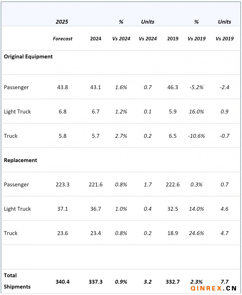 QinRex據(jù)美國(guó)3月6日消息,美國(guó)輪胎制造商協(xié)會(huì)(USTMA)于2025年2月對(duì)當(dāng)年美國(guó)輪胎出貨量進(jìn)行了預(yù)測(cè),預(yù)計(jì)2025年總出貨量為3.404億條,而2024年為3.373億條,2019年為3.327億條。較2024年增加0.9%,較2019年增加2.3%。這也超過(guò)了2024年3.373億條的先前紀(jì)錄。