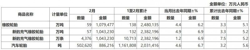 1-2月汽車輪胎出口量為116萬噸,同比增長3.2%;出口金額為203億元,同比增長5.6%。