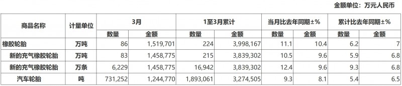1-3月汽車輪胎出口量為189萬噸,同比增長5.4%;出口金額為327億元,同比增長6.5%。