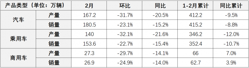 3月11日,中汽協(xié)公布的數據顯示,2月,我國汽車產銷分別完成167.2萬輛和180.5萬輛,環(huán)比分別下降31.7%和23.1%,同比分別下降20.5%和15.2%。