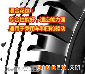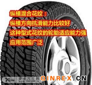 混合花紋是普通花紋和越野花紋之間的一種過渡性花紋。其特點(diǎn)是胎面中部具有方向各異或以縱向?yàn)橹鞯恼y溝槽,而在兩側(cè)則以方向各異或以橫向?yàn)橹鞯膶捇y溝槽。這樣的花紋搭配使混合花紋的綜合性能好,適應(yīng)能力強(qiáng)。它既適應(yīng)于良好的硬路面,也適應(yīng)于碎石路面、雪泥路面和松軟路面,附著性能優(yōu)于普通花紋,但耐磨性能稍遜。目前,一些貨車和四輪驅(qū)動的乘用車多使用這種型式的花紋輪胎。