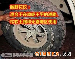越野花紋的共同特點(diǎn)是花紋溝槽寬而深,花紋塊接地面積比較小(約40%~60%)。在松軟路面上行駛時(shí),一部分土壤將被嵌入花紋溝槽之中,必須將嵌入花紋溝槽的這一部分土壤剪切之后,輪胎才有可能出現(xiàn)打滑。據(jù)測試:在泥濘路上,同一車型的車輛使用越野花紋的牽引力可達(dá)普通花紋的1.5倍。