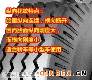 這種花紋共同特點(diǎn)是胎面縱向連續(xù),橫向斷開,因而胎面縱向剛度大,而橫向剛度小,輪胎抗滑能力呈現(xiàn)出橫強(qiáng)而縱弱的特征。這種花紋輪胎的滾動阻力較小,散熱性能好,但花紋溝槽易被嵌入碎石子兒。綜合來看,這種型式花紋適合在比較清潔、良好的硬路面(如城市道路和高速公路)上行駛。例如,轎車、輕、微型貨車等多選擇這種胎紋。