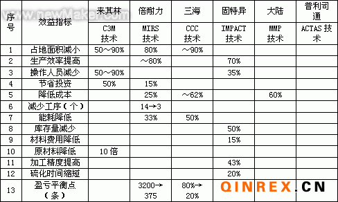 與傳統(tǒng)的輪胎制造工藝技術(shù)相比,上述全新概念工藝技術(shù)普遍具有節(jié)省投資、設(shè)備占地面積少、生產(chǎn)效率高、降低成本的優(yōu)勢,詳見表1。