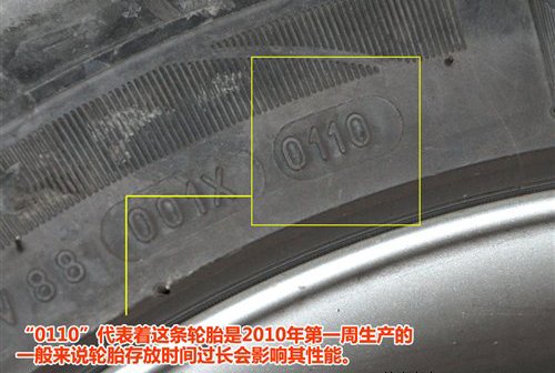 輪胎靠近輪轂的地方可以找到一串4位的數(shù)字,前兩位表示生產(chǎn)周,后兩位表示生產(chǎn)年份,例如上圖中0110就表示是2010年的第1周生產(chǎn)的,因此如果您要更換輪胎的時(shí)候一定要看清楚生產(chǎn)的日期,如果換輪胎的地方告訴你具體到第幾號,你趕緊給他個(gè)大耳光,因?yàn)檩喬ド系纳a(chǎn)日期標(biāo)記是全世界統(tǒng)一的,根本不會標(biāo)到你用的這條輪胎是具體是什么時(shí)候生產(chǎn)的。